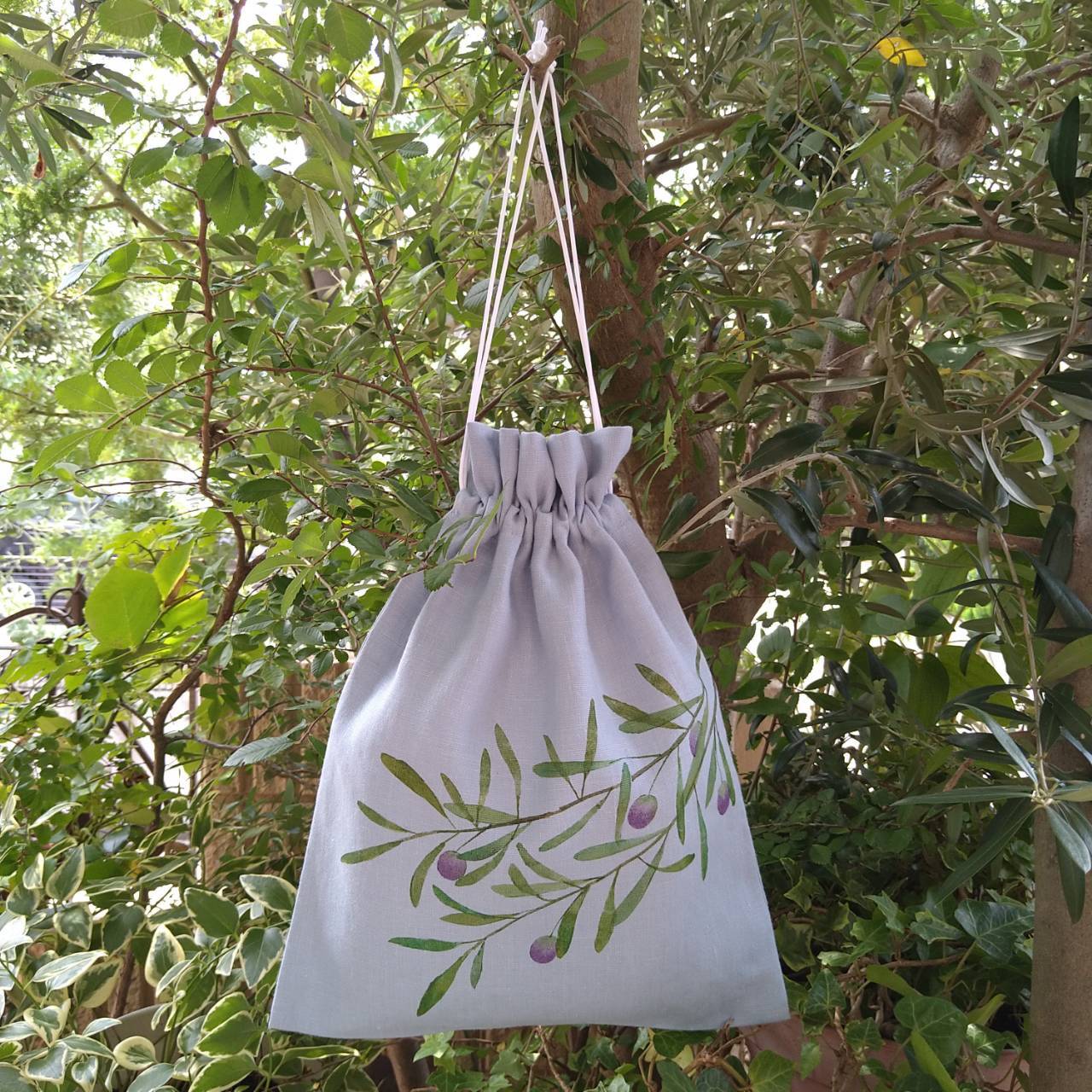 ●素材:リネン ●生地色:オリーブ(ブルー) スミレ(グリーン) サクラ(ピンク) ●本体価格:4,000円 ●サイズ:約 30 × 38 cm ●染柄:写真左から オリーブ スミレ サクラ