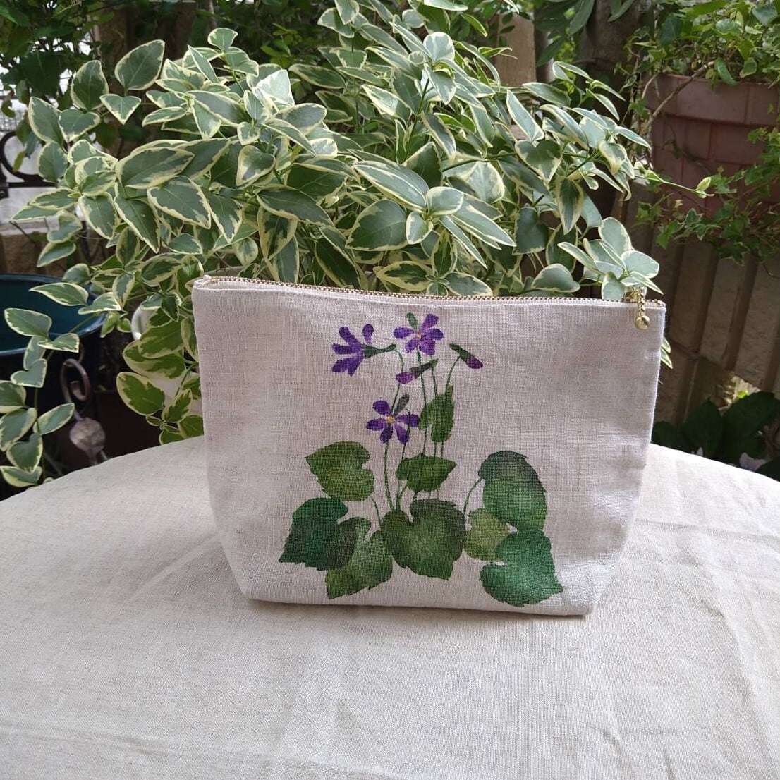 野の花や木の実、動物をハンドメイドプリントでデザインしています。 ●素材:リネン ●生地色:オフホワイト(スミレ、ローズゼラニウム)、グレー(ヒツジ) ●本体価格:4000円 ●サイズ:約20×14×9㎝ 横幅最大22㎝ ●染柄:写真左から スミレ、ローズゼラニウム、ヒツジ